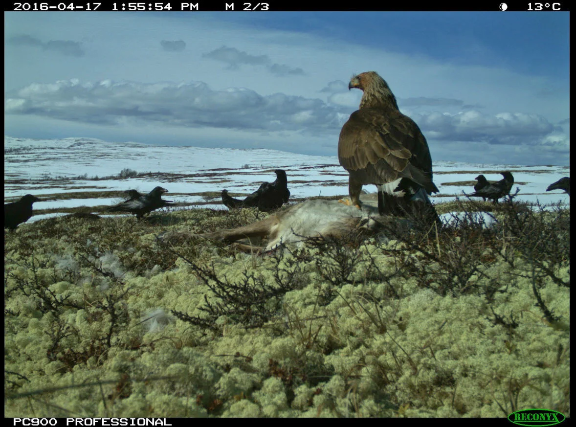 "Den 17. mars ble det funnet en død reinsbukk i Vakkerlifjellet (Knutshø). Bukken hadde dødd helt nylig og ved nærmere undersøkelser viste det seg at reinen var full av både hud- og svelgbrems. Reinen var ellers mager og i dårlig hold. Etter avtale med Olav Strand (NINA) ble det satt opp et viltkamera ved kadaveret for å se hva som forsynte seg av skrotten."