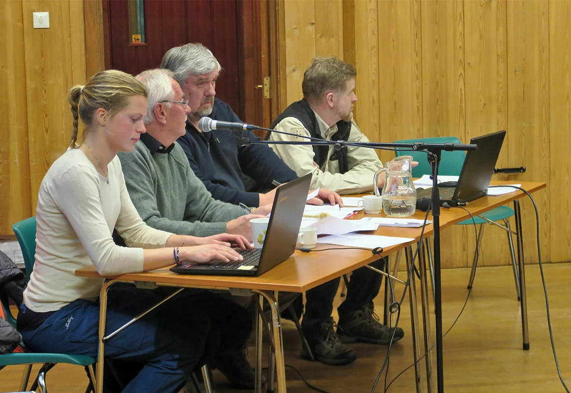 Dirigentbordet. Fra venstre Kristin Lund Austvik (sekretær), Kvikne, Tor Granvold (møteleder), Kvikne, Hallvard Urset (utvalgsleder), Vingelen og Terje Borgos (sekretær i villreinutvalget), Holtålen. Foto: A. Nyaas