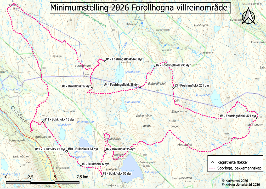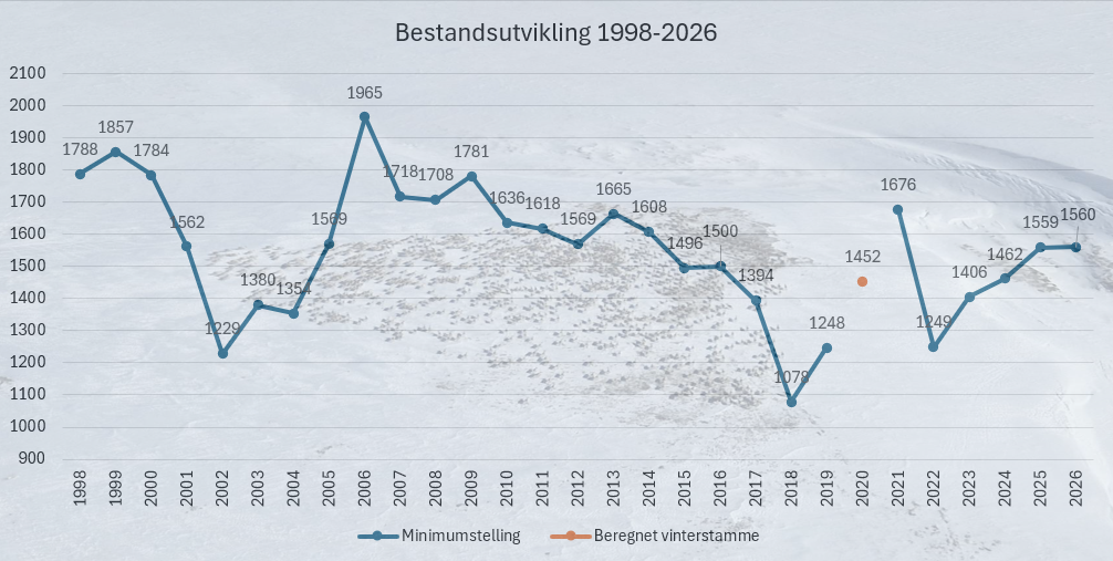 Totalt ble det telt 1560 vinterdyr i villreinstammen i Forollhogna i 2026 (ett dyr mer enn i 2025). Dette er noe mindre dyr enn den beregnede vinterstammen i henhold til bestandsplan, som for 2026 er på 1584 dyr. Forventet stammeutvikling innenfor gjeldende bestandsplan baserer seg på siste minimumstelling i 2023, der det ble telt 1406 dyr. Fordelingen blant disse er beregnet ved hjelp av strukturtallene fra høsten 2022. Deretter er gjennomsnittlig kalveproduksjon og fellingsprosent lagt til grunn. Naturlig dødelighet er økt fra 2,5% i forrige bestandsplan til 4% av vinterflokken. I denne planen vil vi arbeide mot å stabilisere bestanden på ca. 1800 vinterdyr.